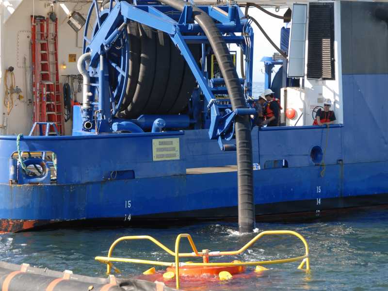 This skimmer utilizes a weir to recover oil. It is attached to a floating umbilical hose with integrated hydraulic and cargo hoses. The skimmer head has an integrated centrifugal pump with a feed screw pump. It can be used in a weir, brush, or disc configuration, applicable to a range of oil viscosities. It is typically deployed in open or coastal waters.