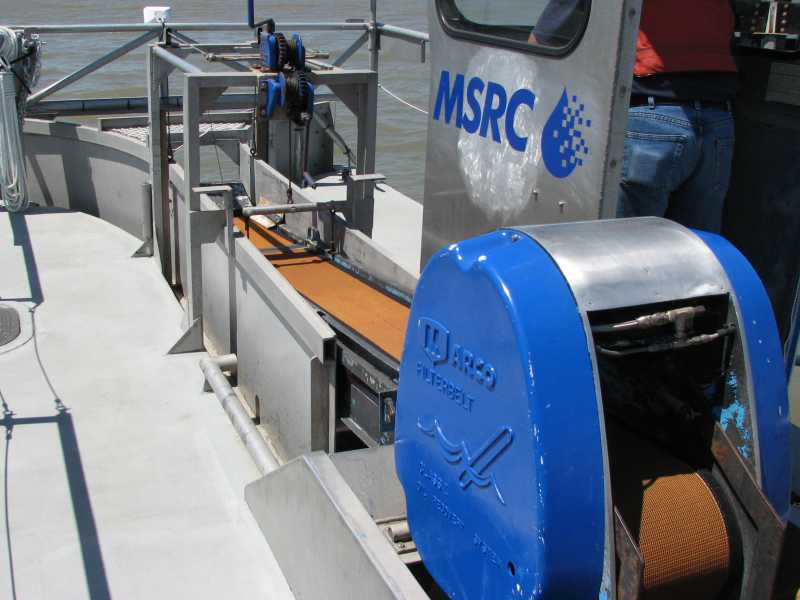 This skimmer utilizes a Marco Filterbelt with a powerful induction pump behind a rotating oleophilic belt to recover oil from the water's surface. It is designed to recover light diesel to heavy crude oils. Recovered fluid and debris is removed from the belt and collected into a sump. It is typically deployed in near coastal or near-shore waters.