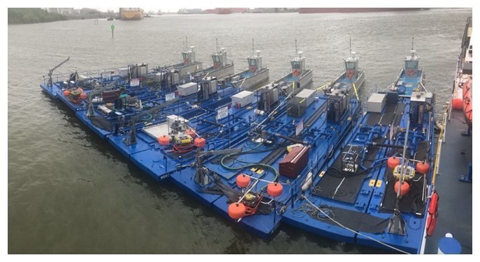 The SBS is typically used in a near-shore or inland environment for on water recovery operations, but may also be used as a staging site for near to shore booming operations, decontamination processes or storage for other on water skimming assets. The non-self propelled unit is propelled through the water by a 26' or 28' shallow water push boat.