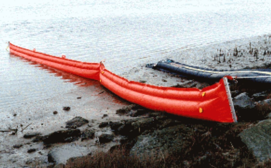 Boom designed to float at high tide and seal to a flat, exposed shoreline at low tide in an intertidal zone.
